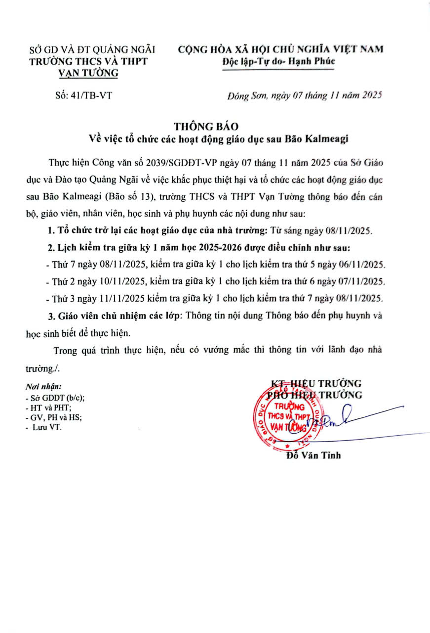 Thông báo Hoạt động dạy và học trở lại sau Bão số 13